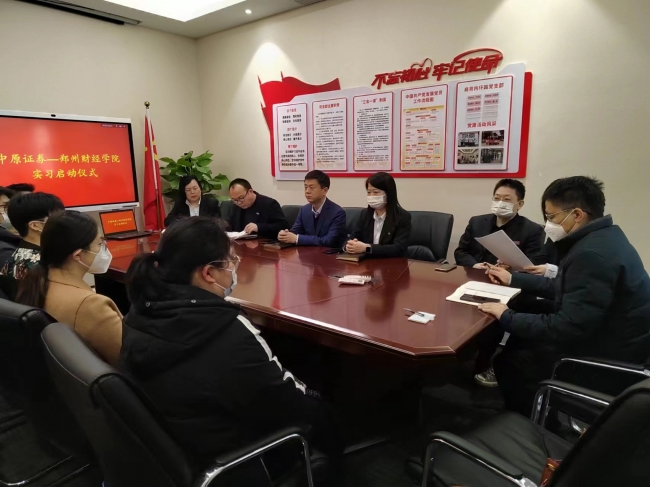 董学力一行首先来到中原证券郑州分公司并开展校企座谈。会上,中原证券郑州分公司总经理辛志红致欢迎辞,介绍了学生在中原证券实习的情况,双方就2023年学生实习就业情况进行深入交流和探讨。
