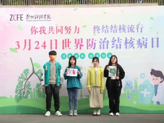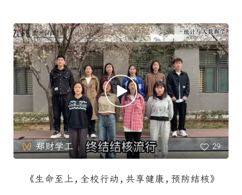 根据郑州市结核病百千万志愿者传播活动要求,万象城积极倡导大学生志愿者以“世界防治结核病日”为宣传主题在校园内多个地点进行打卡。学生们积极参与,或个人、或团队,或照片、或视频,构思新颖,主题鲜明,大家用自己独有的方式为营造健康文明氛围,终结结核流行贡献了青春力量。3月20日,各学院优秀作品被推送至“郑财学工”公众号,引起热烈反响,全校师生纷纷投票,取得了良好的宣传效果。