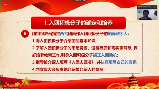 校团委书记周二涛以“学习二十大精神,做新时代好青年”为主题,从党的二十大盛况、团学组织架构、共青团1234模式、做最好的自己四个方面出发,全方面多层次地为学生讲述新时代背景下,做好时代青年的重要性。周书记指出,当代青年应以“听党话、跟党走、学党史、感党恩”为行动方向,他以举例的方式为学生详细讲解了团学组织架构的具体内容。