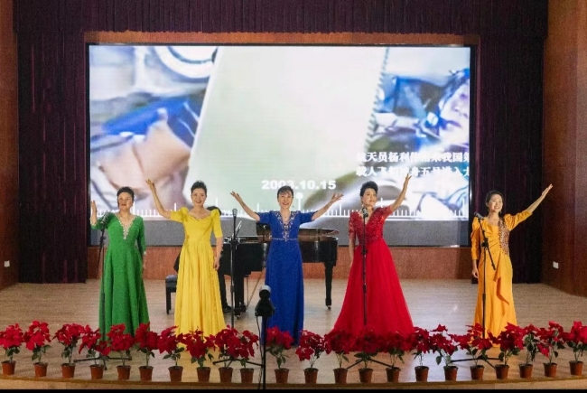 音乐会在开场曲爱国赞歌《我的祖国》中拉开帷幕,王艳霞、王静、张伟芳、牧敏、张栩歌老师深情演唱,深切地表达了浓烈的爱国主义思想,激起了在场师生深深爱国情。