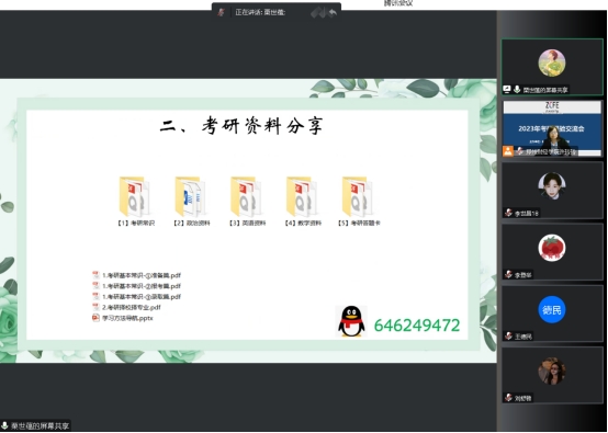17位2023年考研拟录取同学分别介绍了自己的考研历程,从考研心理准备、择校、英语政治数学的复习资料及相关资源推荐、寻找信息的途径、如何准备复试和调剂等方面进行了详细分析。拟录取同学一致认为考研初试成绩足够高才是王道,要积极找学长学姐咨询信息,劳逸结合、保持健康体魄,要坚定自己目标、保持自己节奏,相信选择大于努力,适合自己的考研学校才是最好的。同学们精心准备,将自己考研过程中的资源和学习方法都倾囊相授,并表示未来将不遗余力地帮助学弟学妹考研。