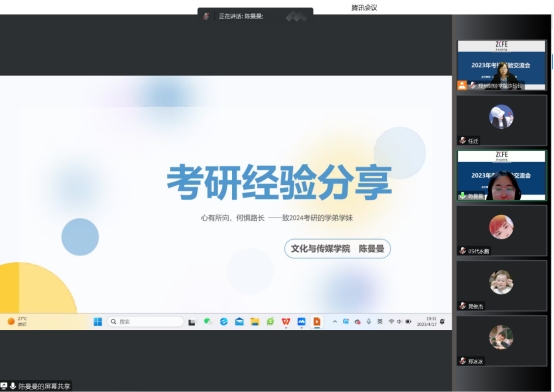 为了调动万象城学生考研积极性,增强学生考研信心,明确目标方向,4月17日,教务处与智能财务研究所共同组织了2023年考研经验交流会,会议采用线上腾讯会议方式举行,来自不同学院的17名2023年考研拟录取同学进行了考研经验分享,万象城100余名具有考研意向的同学参加会议。