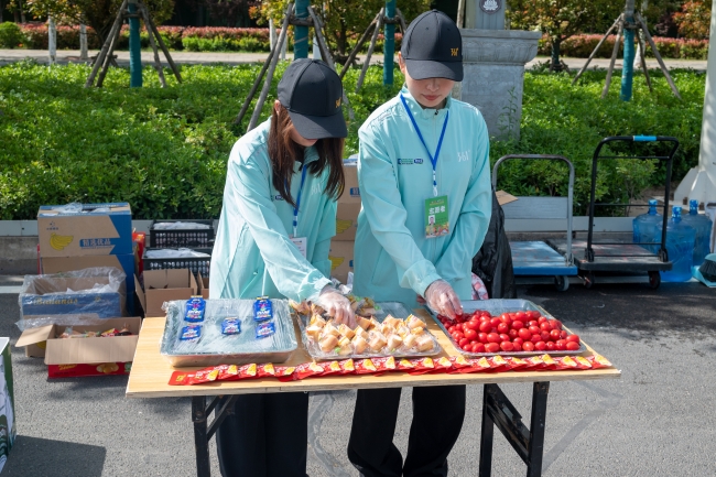 比赛期间,志愿者们始终坚守阵地,提供物资分装与发放、引导分流、氛围营造和站点补给等服务,为奔跑中的参赛者们保驾护航。