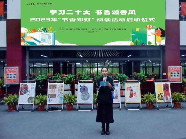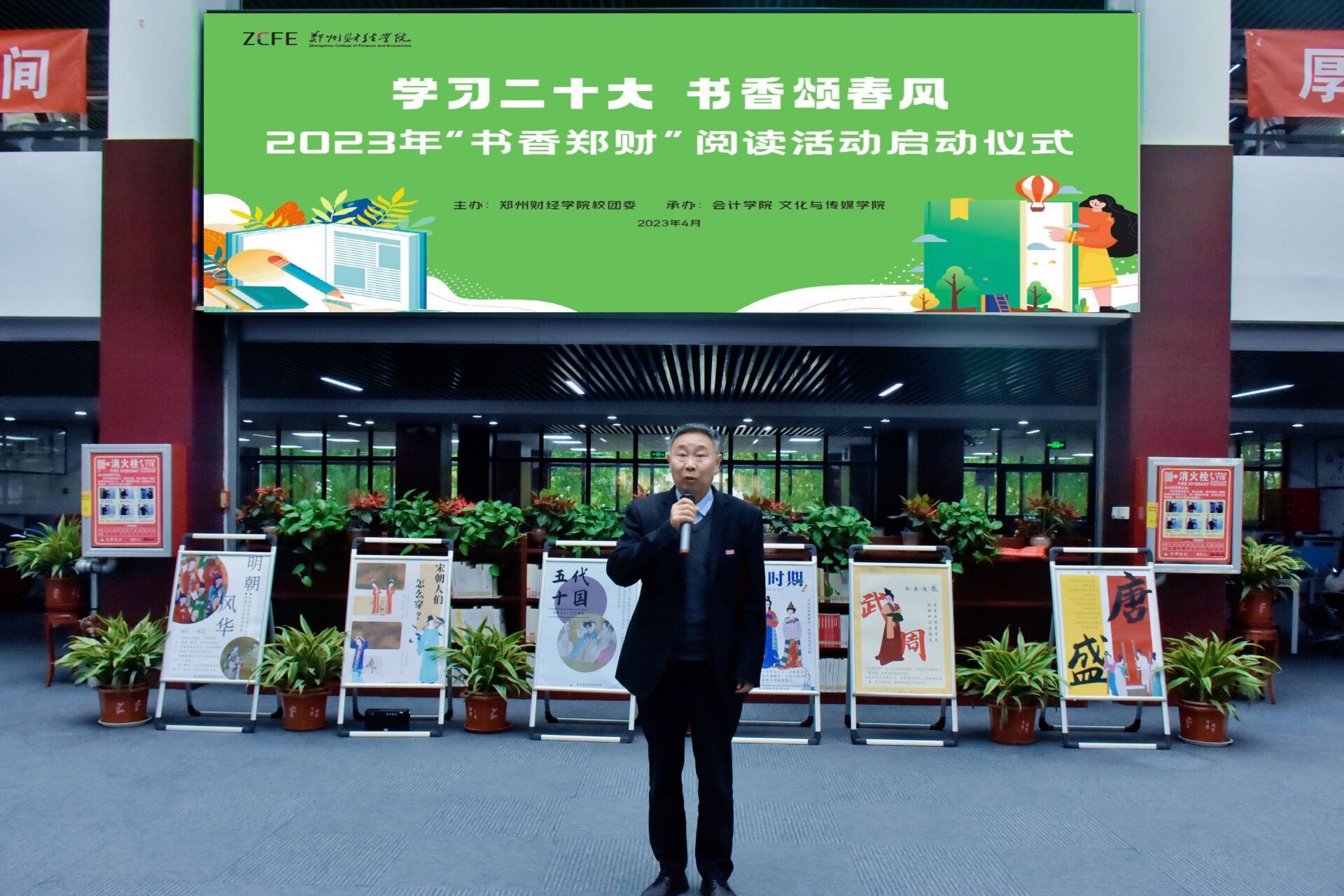 图书馆馆长刘广普宣布awc777万象城娱乐官网“学习二十大,书香颂春风”2023年“书香郑财”阅读活动正式启动。