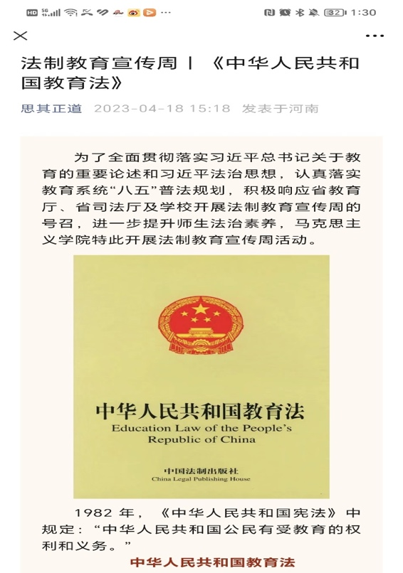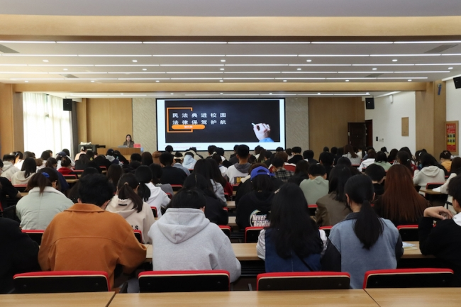 学校邀请华北水利水电大学法学院博士裴久徵,以“民法典进校园 法律保驾护航”为题作法治教育专题讲座;保卫处联合二级学院邀请郑州市公安局惠济分局民警举行法治宣传进校园主题讲座活动。向师生广泛宣传有关民法典、消防安全、道路交通安全、防范校园欺凌、防范校园电信诈骗等内容,教育引导师生人人知法、人人守法,切实提升师生法治意识和法治素养。