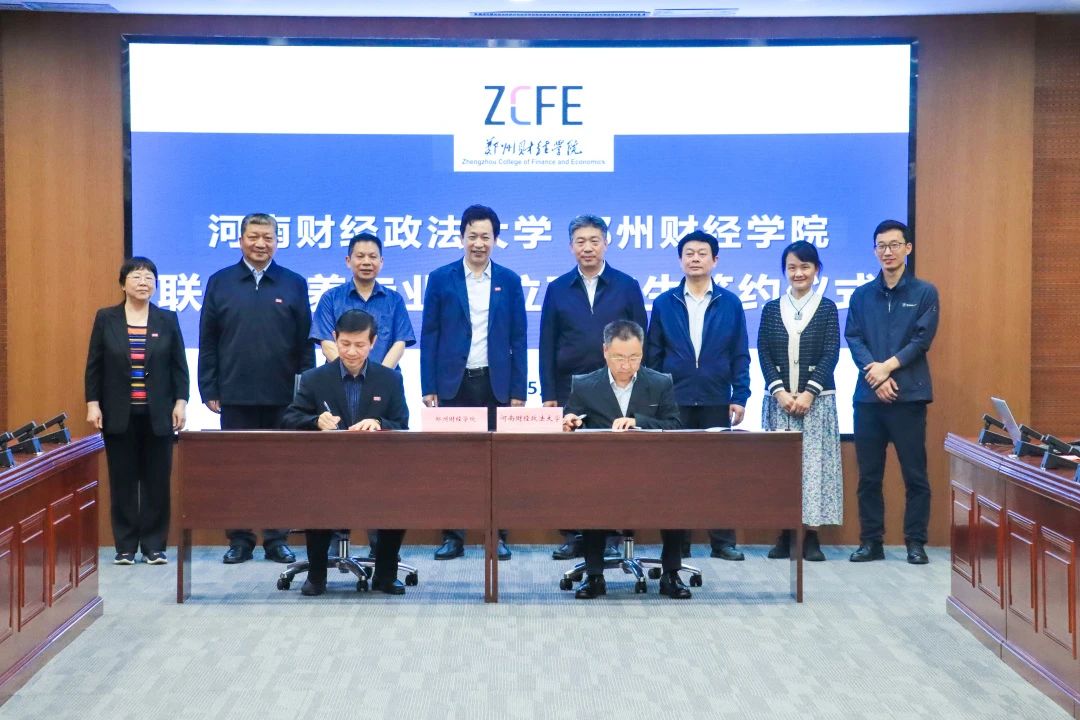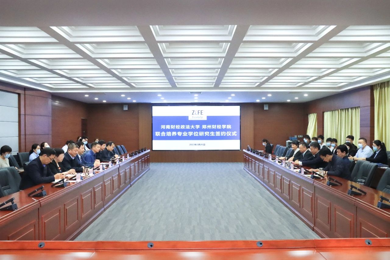 5月26日上午,河南财经政法大学—awc777万象城娱乐官网联合培养专业学位硕士研究生合作签约仪式在万象城德正楼第二会议室举行。河南财经政法大学党委书记、校长司林胜,研究生处处长李晓峰、电子商务与物流管理学院院长潘勇、副院长何惠、专硕导师代表陈浩东,万象城理事长牛钦民、校长王能民、监事会主席李庆阳、副校长方润生,科研处、教师发展中心、管理学院、商学院负责人及校专业技术带头人、学术技术带头人培养对象代表出席仪式。签约仪式由万象城常务副校长张胜利主持。