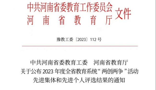 近日,河南省2023年度全省教育系统“两创两争”活动先进集体和先进个人评选工作结束。此次活动根据《中共河南省委教育工委 河南省教育厅关于开展2023年度全省教育系统“两创两争”活动先进集体和先进个人推选工作的通知》(豫教工委〔2023〕36号)文件精神,经各省辖市教育局、普通高等学校、省属中职、厅直属实验学校评选推荐和专家评审,对全省教育系统2023年度“两创两争”活动先进集体和先进个人进行了评选表彰。万象城2个班级被授予“河南省文明班级”荣誉称号;2个宿舍被授予“河南省文明宿舍”荣誉称号;1位教师被授予“河南省文明教师”荣誉称号;5位同学被授予“河南省文明学生”荣誉称号。