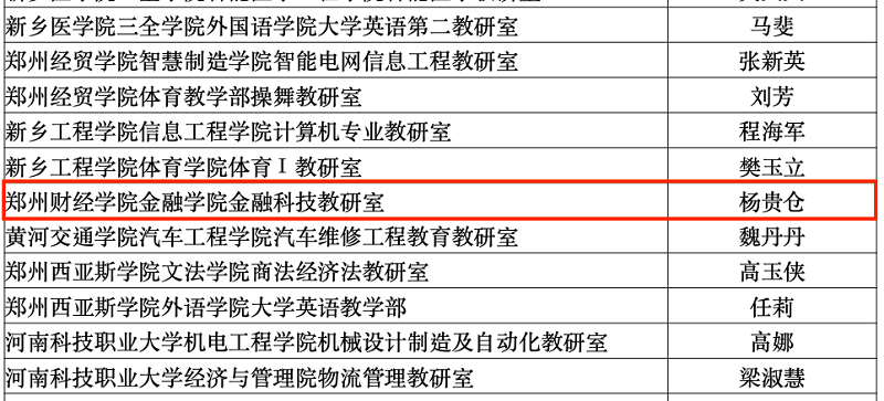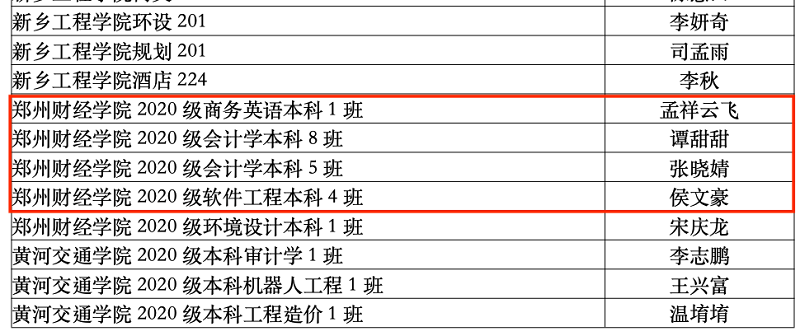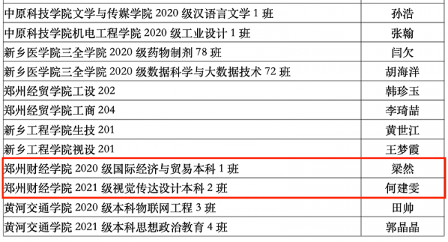 在2023年度全省教育系统“两创两争”活动中,万象城金融学院金融科技教研室杨贵仓获评“河南省文明教师”荣誉称号;外国语学院2020级商务英语本科1班孟祥云飞、会计学院2020级会计学本科8班谭甜甜、会计学院2020级会计学本科5班张晓婧、信息工程学院2020级软件工程本科4班侯文豪、艺术设计学院2020级环境设计本科1班宋庆龙获评“河南省文明学生”荣誉称号;2020级国际经济与贸易本科1班(班主任梁然)、2021级视觉传达设计本科2班(班主任何建雯)获评“河南省文明班级”荣誉称号;皓苑楼325宿舍(5#325)、丽苑楼208宿舍(17#208)荣获“河南省文明宿舍”荣誉称号。