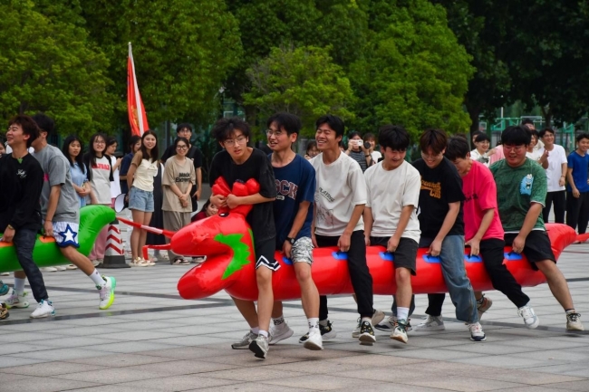 随后,由各二级学院组成的队伍展开了一场精彩绝伦的“旱地龙舟”比赛,现场比赛选手拼尽全力,观众加油呐喊助威,比赛现场氛围热烈。