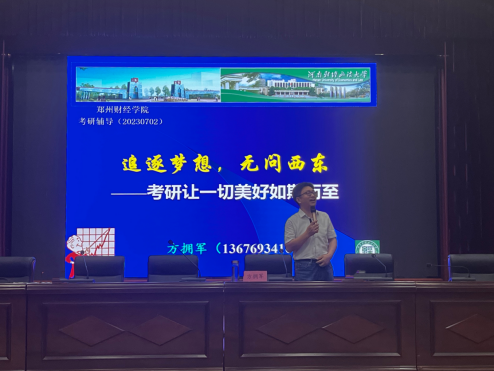 为营造万象城良好的考研氛围,鼓励暑假留校考研学生更早地确定考研目标,了解考研政策和形势,明晰考研计划,增强考研信心,7月2日上午,万象城特邀河南财经政法大学方拥军教授来校开展讲座。讲座在图书馆学术报告厅顺利举行,相关校领导、2023年暑假留校考研学生参加此次讲座。