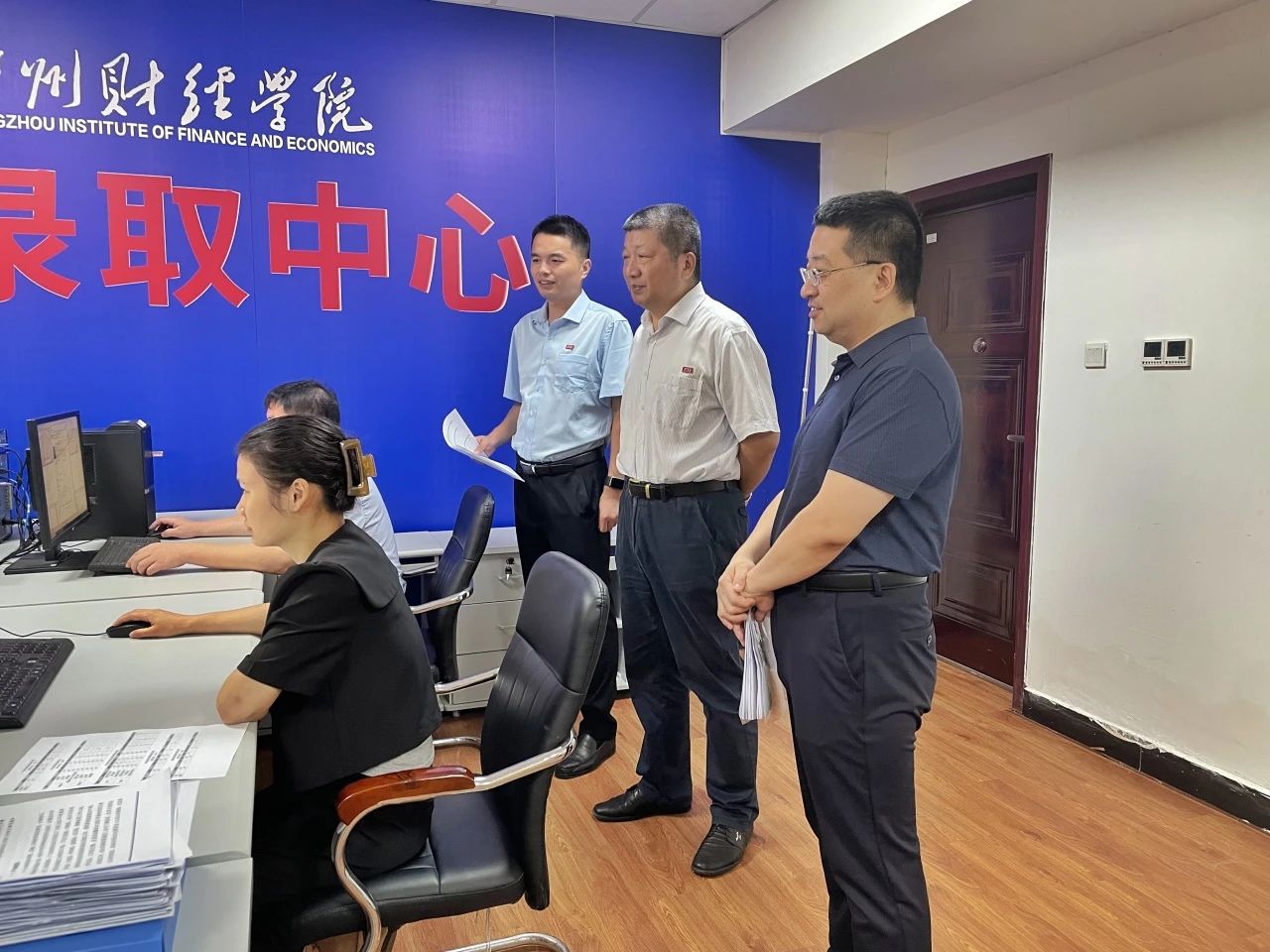 7月22日,河南省艺术类本科B段投档录取期间,校监事会主席李庆阳、纪委书记李赞到万象城普通高招录取中心调研指导高招录取工作,慰问招生录取工作人员。招生办主任时健作工作汇报。