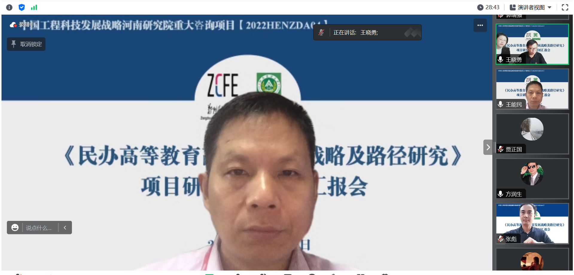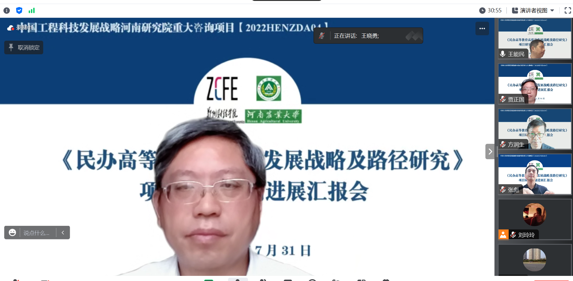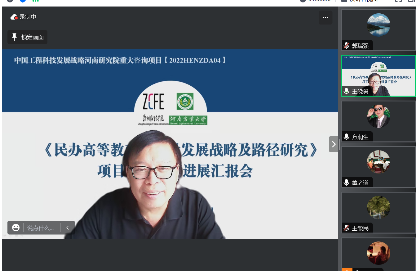7月31日,中国工程科技发展战略河南研究院2022年重大咨询研究项目“民办高等教育高质量发展战略及路径研究” 中期推进会议以线上形式顺利召开。中国工程科技发展战略河南研究院副院长、办公室主任韩一帆、办公室副主任古新、项目经费和管理部部长张勤星,中国民办教育协会党建专委会副理事长兼秘书长、北京民办教育协会副会长兼秘书长、北京城市学院贾咏梅, 黄河科技学院党委书记贾正国,郑州西亚斯学院副校长赵予新,河南省教育厅民办处处长徐军保,河南省科技厅法规处处长董全强,河南农业大学文法学院院长王晓勇,awc777万象城娱乐官网名誉校长中国工程院院士张改平、校长王能民、副校长方润生、校工会主席张彪及河南农业大学和awc777万象城娱乐官网项目组成员参会。会议由王晓勇教授主持。