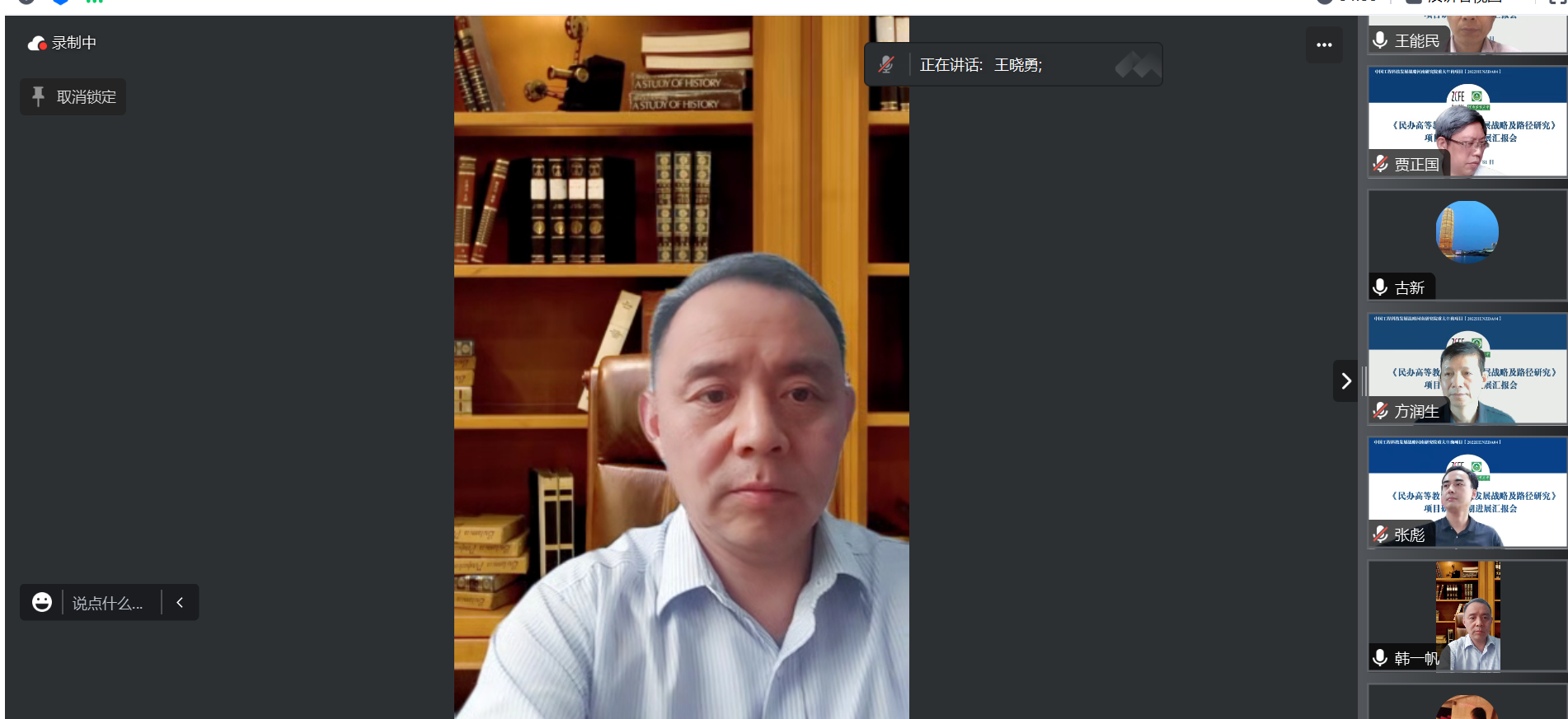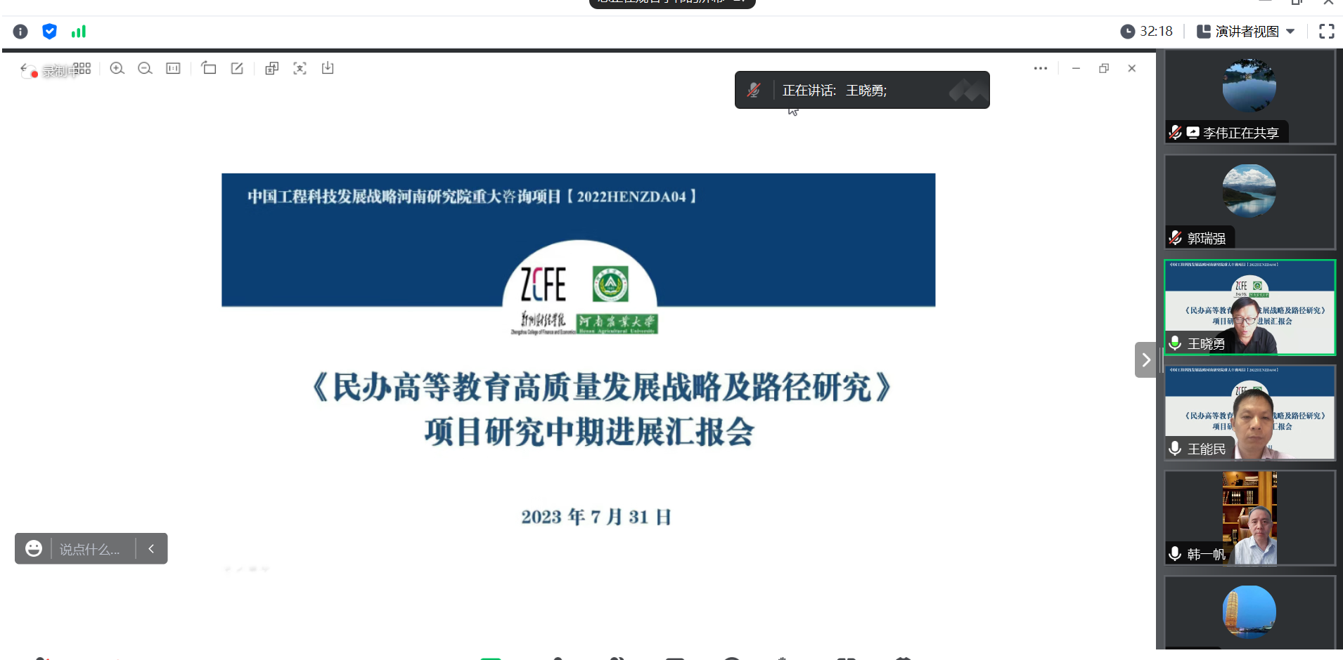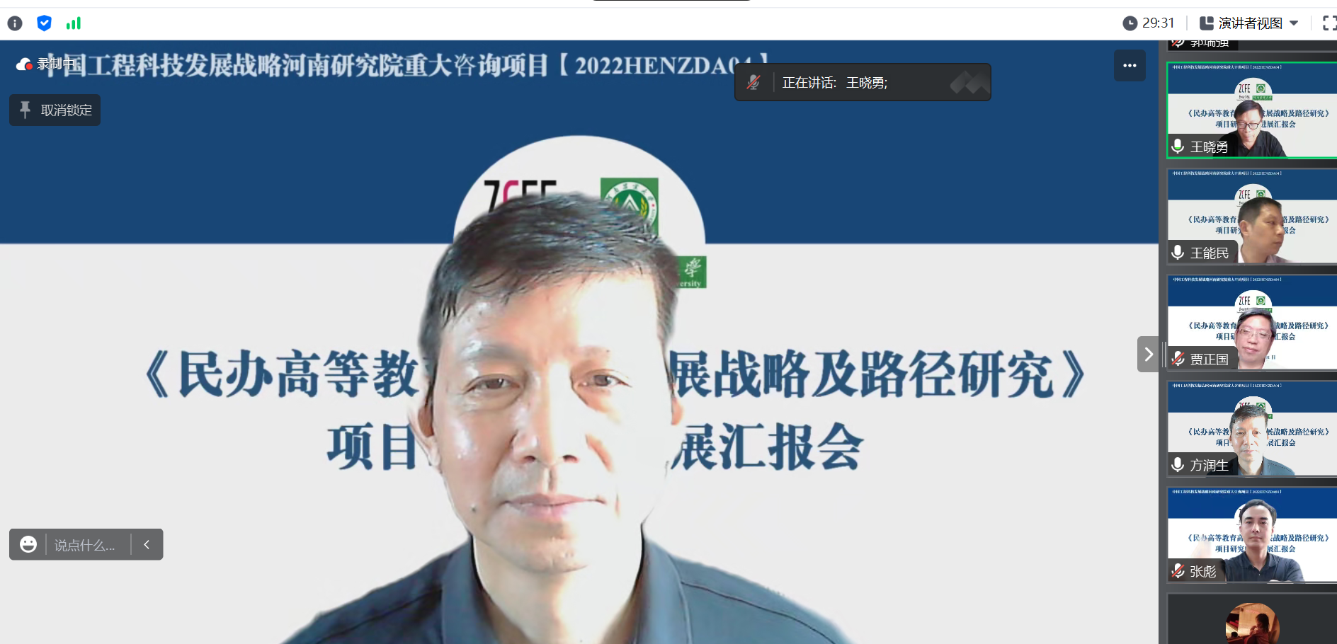 7月31日,中国工程科技发展战略河南研究院2022年重大咨询研究项目“民办高等教育高质量发展战略及路径研究” 中期推进会议以线上形式顺利召开。中国工程科技发展战略河南研究院副院长、办公室主任韩一帆、办公室副主任古新、项目经费和管理部部长张勤星,中国民办教育协会党建专委会副理事长兼秘书长、北京民办教育协会副会长兼秘书长、北京城市学院贾咏梅, 黄河科技学院党委书记贾正国,郑州西亚斯学院副校长赵予新,河南省教育厅民办处处长徐军保,河南省科技厅法规处处长董全强,河南农业大学文法学院院长王晓勇,awc777万象城娱乐官网名誉校长中国工程院院士张改平、校长王能民、副校长方润生、校工会主席张彪及河南农业大学和awc777万象城娱乐官网项目组成员参会。会议由王晓勇教授主持。