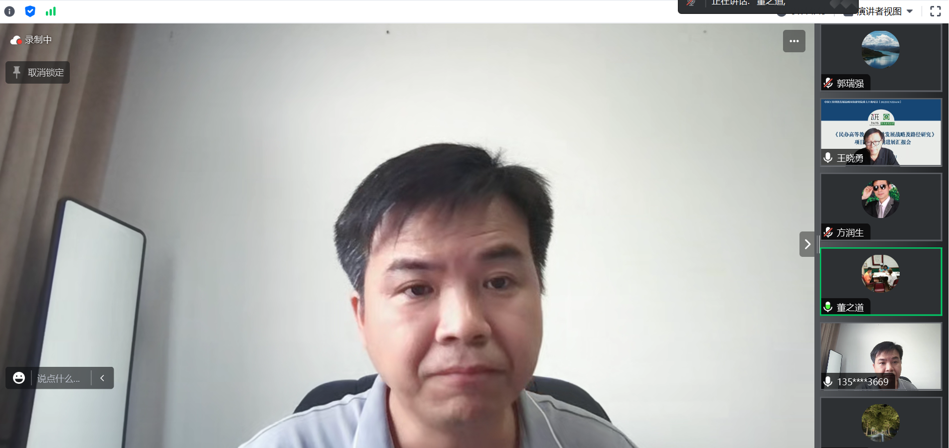 中国工程科技发展战略河南研究院副院长韩一帆讲话。他表示民办高校是河南民办教育的重要力量,由张改平院士牵头立项的《民办高等教育高质量发展战略及路径研究》项目中期推进会正常举行。项目组坚持学习研究,根据目标任务书的要求,以若干民办高校为样本开展了一系列调研,取得了一系列科研成果,希望下一步项目组根据任务书的安排,进一步开展完成工作,河南研究院将会为项目组工作的开展做好服务。