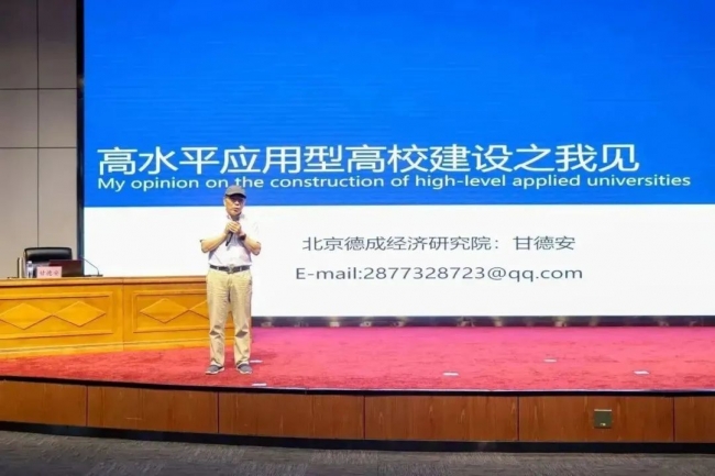 下午,北京德成经济研究院院长甘德安教授作题为《高水平应用型高校建设之我见》的专题讲座。他结合高水平应用型大学建设背景,基于国内外高校建设和发展的比较,从“高水平应用型高校建设的标准是什么”“高水平应用型高校建设的内核是什么”“高水平应用型高校建设的的若干建议”三个方面全面解读了高水平应用型高校的定位、治理结构及建设高水平应用高校的前提、抓手、人才培养方式和产教融合路径等。