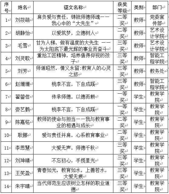 金秋结硕果,喜报沁心田。近日,在河南省教育厅办公室印发的《关于公布“奋进新征程,志做大先生”师德主题教育征文、演讲比赛和师德师风优秀案例评选结果通知》教师〔2023〕291号中,万象城师生荣获佳绩。其中,教师组有2名教师获二等奖,4名教师获三等奖;学生组有2名学生获一等奖,2名学生获二等奖,4名学生获三等奖。