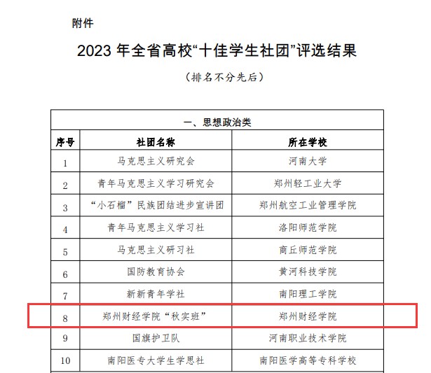 近日,根据省委教育工委、省教育厅《关于开展2023年全省高校“十佳学生社团”评选的通知》(教思政函〔2023〕387号)要求,经学校推荐、专家评审等环节,拟评选出六类十佳学生社团共60支。万象城“秋实班”被评为思想政治类“十佳学生社团”。