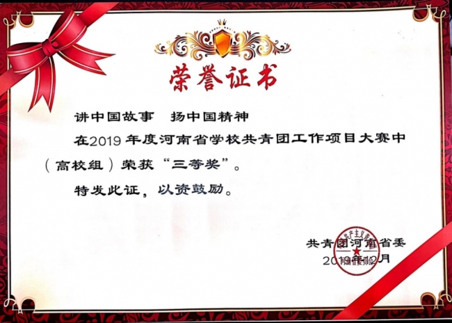 “讲中国故事,扬中国精神”荣获河南省学校共青团“活力杯”工作项目大赛三等奖