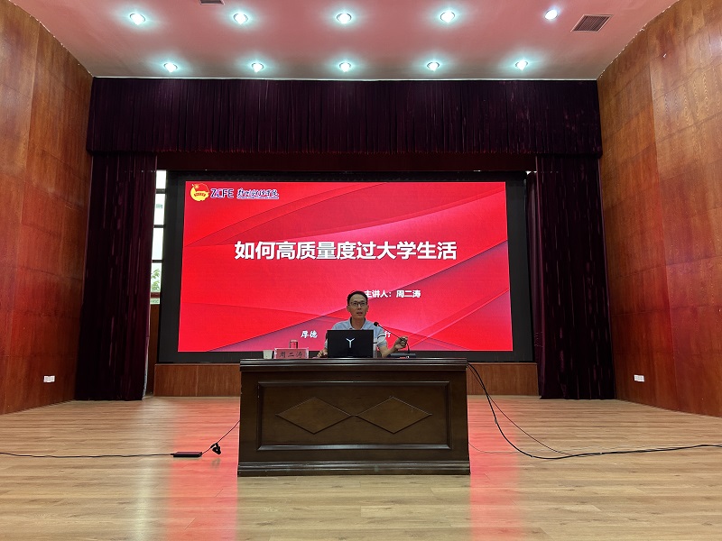 校团委书记周二涛作《如何高质量度过大学生活》专题讲座,从对学校的了解谈起,讲到“如何认识自己”,教新生如何规划大学生活,找准榜样,实现自我的突破。