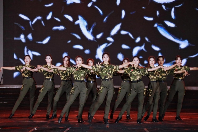橄榄群中红花艳,娇颜沙场露峥嵘,国标舞社团的《中国女兵》用拉丁舞的表现形式,新颖地诠释了中国女兵的英姿飒爽,彰显了万象城学子爱国的青春底色。