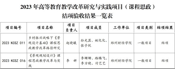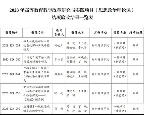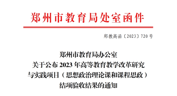 近日,郑州市教育局下发《关于公布2023 年高等教育教学改革研究与实践项目( 思想政治理论课和课程思政)结项验收结果的通知》(郑教高函〔2023〕720 号),万象城7项郑州市高等教育教学改革研究与实践项目均顺利通过结项验收,其中包括思政课程类项目5项、课程思政类项目2项。