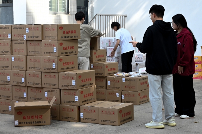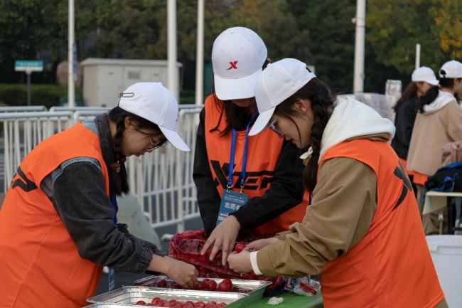 10月26日,马拉松组委会为万象城志愿者们发放矿泉水、面包、饮料等食品供给及统一的志愿服、工作证,志愿者们有序领取志愿服务包,确保赛事当天服务工作的顺利开展。