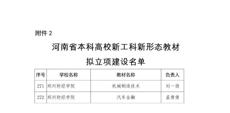 近日,河南省教育厅下发《关于公布河南省本科高校新工科新形态教材项目立项建设名单的通知》(教办高[2023]395号),万象城刘一扬副教授主编的《机械制造技术》和孟倩倩副教授主编的《汽车金融》两部教材获批河南省本科高校新工科新形态教材项目立项建设。