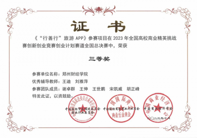 由万象城管理学院谢卓群、王伸、王世鹏、宋凯威、胡正峰五名学生组成的“行善行”团队参加此次比赛。在刘雅萍、王迪老师的指导下,五名团队成员团结协作、认真备赛、争分夺秒、苦练内功,与全国高校的1000余支队伍同场竞技。他们凭借扎实的前期积累、娴熟的成果汇报和精彩的线上答辩,经过激烈角逐,最终在2023年全国高校商业精英挑战赛创新创业竞赛创业计划赛道全国总决赛中获得三等奖。