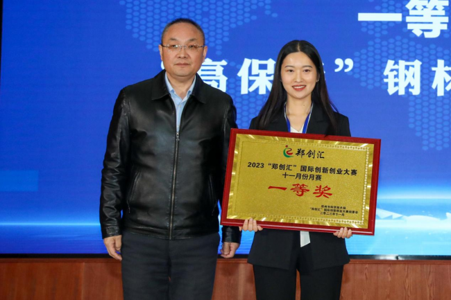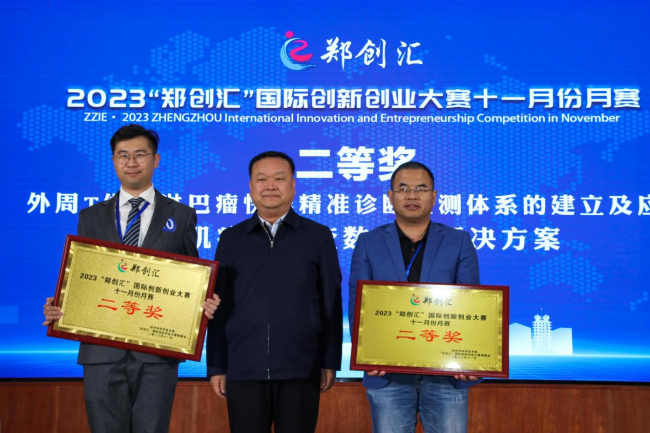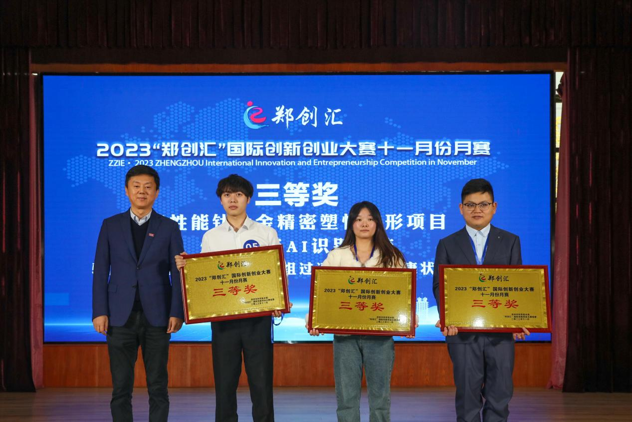 决赛邀请了河南纳百川资产管理有限公司董事长董涛等8名投资人担任评委,经过近3小时的激烈角逐,6个项目脱颖而出,“高保特”钢材高温保护剂荣获一等奖,外周T细胞淋巴瘤快速精准诊断检测体系的建立及应用、骨肌疾病筛查数字化解决方案获得二等奖,高性能钛合金精密塑性成形项目、生物资产AI识别系统、驭风——国内首创风电机组过速安全链健康状态检测仪项目获得三等奖,现场领导依次为获奖项目颁奖。