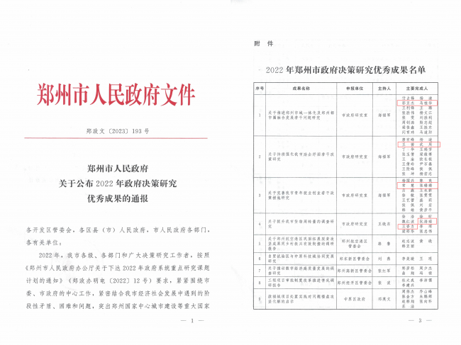 据悉,本次获奖成果均为郑州市各级、各部门和广大决策研究工作者按照《郑州市人民政府办公厅关于下达2022年政府系统重点研究课题计划的通知》要求,紧密围绕市委、市政府的中心工作,突出郑州国家中心城市建设等重大国家战略的实施,对我市经济社会发展中的重大问题进行深入细致的调查研究形成的成果,并为各级各部门科学决策、及时有效地推动工作提供了重要借鉴。