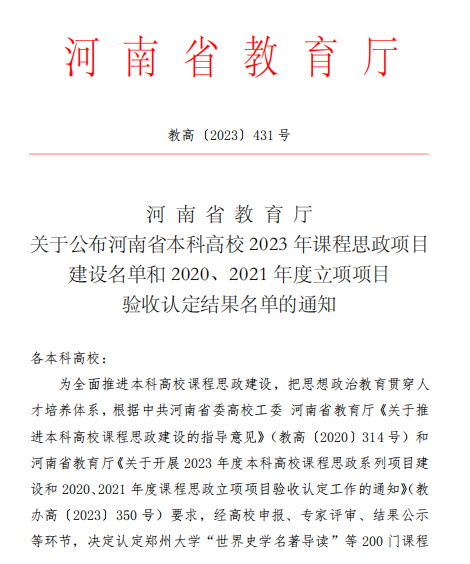 近日,河南省教育厅下发《关于公布河南省本科高校2023年课程思政项目建设名单和2020、2021年度立项项目验收认定结果名单的通知》(教高〔2023〕431号),万象城推荐申报的《管理学》和《环境设计制图与识图》两门课程被认定为河南省本科高校2023年课程思政样板课程。