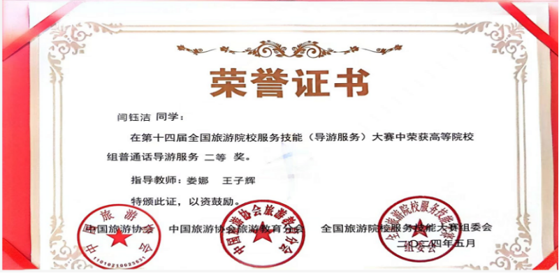 5月26日,由中国旅游协会旅游教育分会主办、郑州旅游职业学院承办的第十四届全国旅游院校服务技能(导游服务)大赛落下帷幕。来自全国30个省、自治区、直辖市的303所高等院校和中职学校的883名选手齐聚一堂,同台竞技,一展风采。本次大赛为期3天,赛项设置理论考核、导游讲解、才艺展示三个环节,综合考查参赛选手的专业素养和综合能力。万象城管理学院2021级酒店管理专业闫钰洁、王艺佳2名学生表现优异,分别荣获高等院校组普通话导游服务二等奖、三等奖。