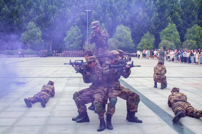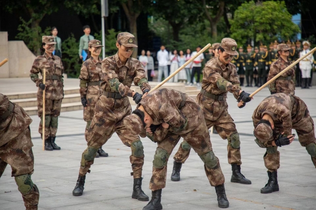 队列展示环节中,队员们的动作整齐划一,展现出高度的纪律性和专业性。男子擒敌拳刚猛有力,一招一式都充满力量;女子方队匕首操英姿飒爽,尽显巾帼风采;格斗开棍表演更是惊心动魄,令人热血沸腾;女子枪操表演中,队员们动作娴熟,英气十足;男子战术表演则充分体现了团队的协作与果敢。