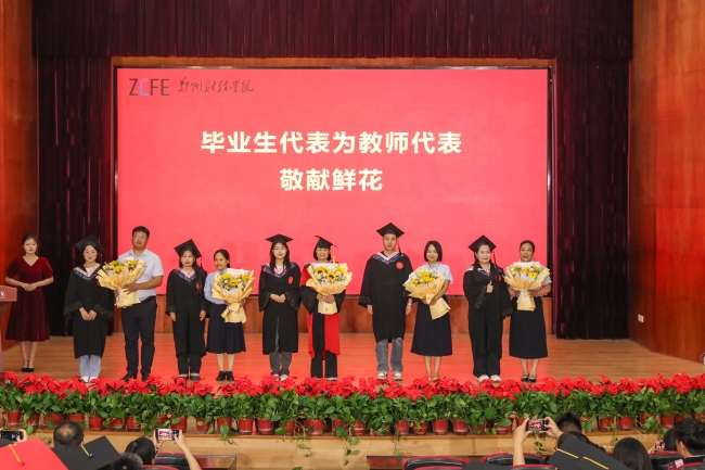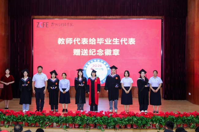 学校为每位毕业生准备了一枚饱含祝福的毕业纪念徽章。教师代表为学生代表赠送徽章。随后,毕业生代表向教师代表敬献鲜花,感谢各位老师的谆谆教诲。
