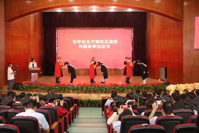 党委书记马治军、校长吴中、监事会主席李庆阳为获得学士学位的2024届毕业生代表扶正流苏,并颁发学位证书。