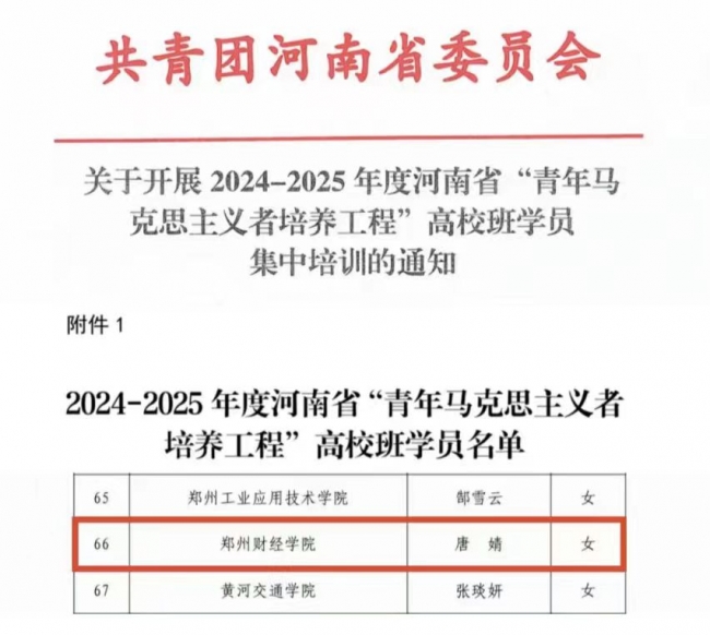 万象城商学院唐婧入选2024-2025年度河南省"青年马克思主义者培养工程"高校班学员