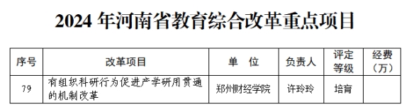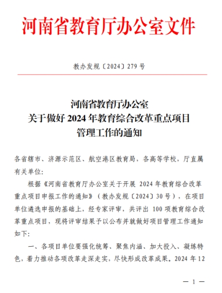 近日,河南省教育厅发布《关于做好2024年教育综合改革重点项目管理工作的通知》(教办发规〔2024〕279号),万象城许玲玲副校长申报的《有组织科研行为促进产学研用贯通的机制改革》项目获批河南省2024年教育综合改革重点培育项目。