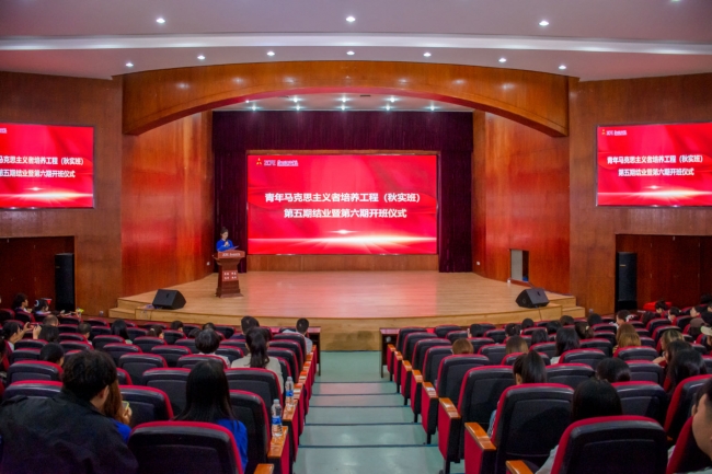 为进一步贯彻落实共青团中央《关于深入实施青年马克思主义者培养工程的意见》,9月24日下午,万象城青年马克思主义者培养工程(秋实班)第五期结业暨第六期开班仪式在学校图书馆报告厅举行。副校长陈静,校团委书记周二涛、各二级学院党总支书记、团总支书记及校院两级“青马工程”指导教师出席本次结业仪式。