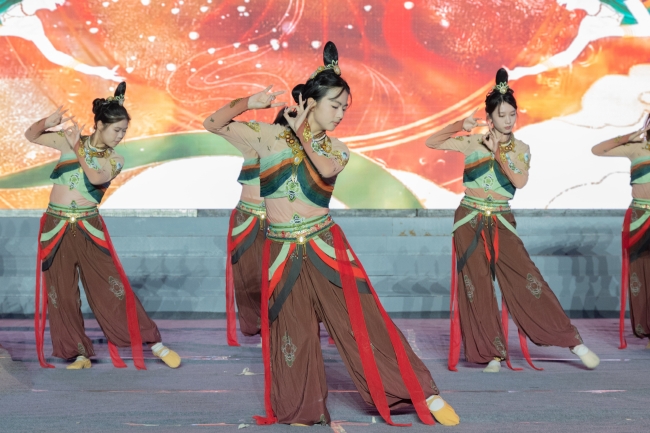 民族舞《伎乐飞天》以敦煌壁画为灵感源泉,将古老的艺术与现代审美完美融合,舞者们身着色彩斑斓、飘逸如云的服饰,或旋转、或跳跃,以曼妙的舞姿诉说着千年的故事。