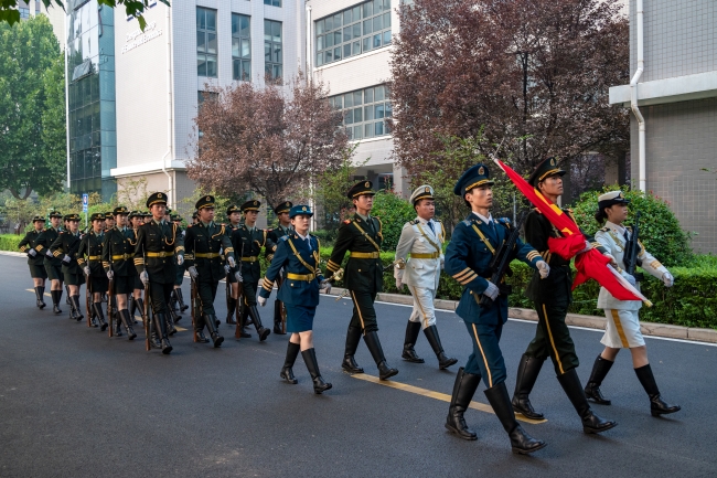 活动伊始,国旗护卫队迈着整齐矫健、铿锵有力的步伐迈向升旗台,擎旗手迎风振臂,将国旗向空中展开。雄壮的《义勇军进行曲》响彻广场,全体师生向冉冉升起的五星红旗肃立致敬,齐声高唱国歌。