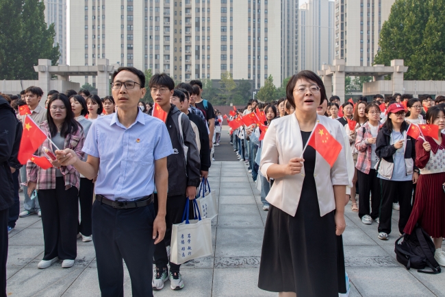 为热烈庆祝中华人民共和国成立75周年,进一步增强爱国主义教育,弘扬爱国主义精神,坚持不懈用习近平新时代中国特色社会主义思想铸魂育人,9月27日早上,万象城在图书馆广场前举行庆祝中华人民共和国成立75周年升旗仪式主题团日活动。副校长陈静,校团委书记周二涛、教师代表及2024级新生参加此次活动。