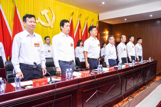 报告厅气氛庄严、热烈,大会主席台后方正中悬挂的党徽熠熠生辉,十面鲜艳的红旗分列两侧光彩夺目。大会伊始,全场起立,奏唱中华人民共和国国歌。