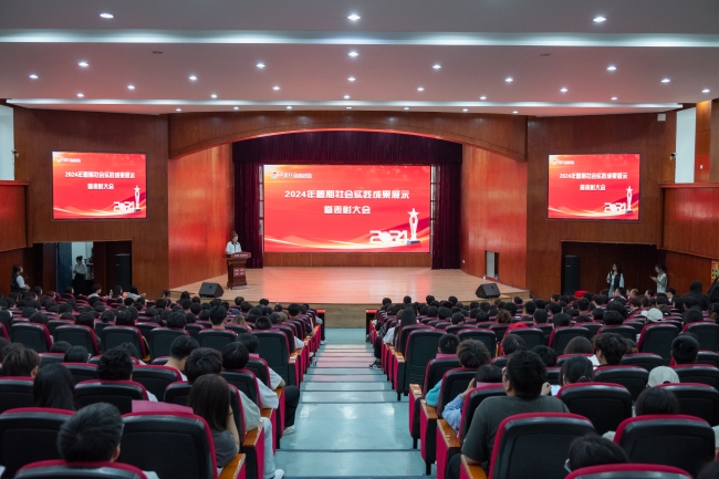 在场师生共同观看2024年暑期社会实践总结视频,回顾万象城64支实践团队在暑期社会实践中精彩的活动点滴。