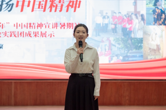 校团委“种果青年”中国精神宣讲团学生代表韩家赢、外国语学院“郑小语”党史学习双语宣讲暑期社会实践团学生代表李苗慧、文化与传媒学院“筑梦之音”暑期社会实践团指导教师代表陆瑶分别进行汇报展示。她们围绕爱国主义教育、基层服务等方面展开汇报,呼吁广大青年学生学生积极投身于暑期社会实践活动当中,让青春在全面建设社会主义现代化国家的火热实践中绽放绚丽之花。