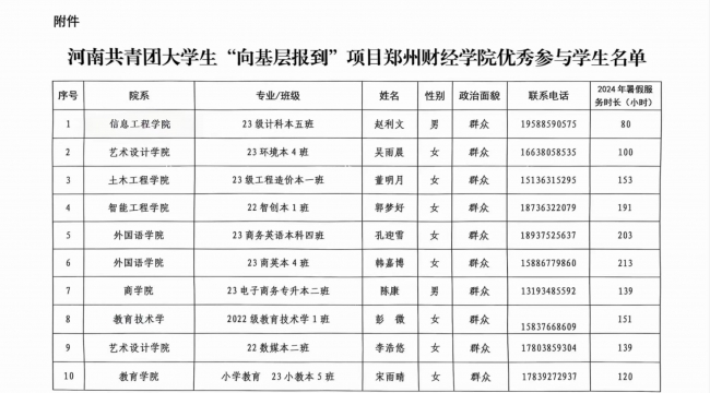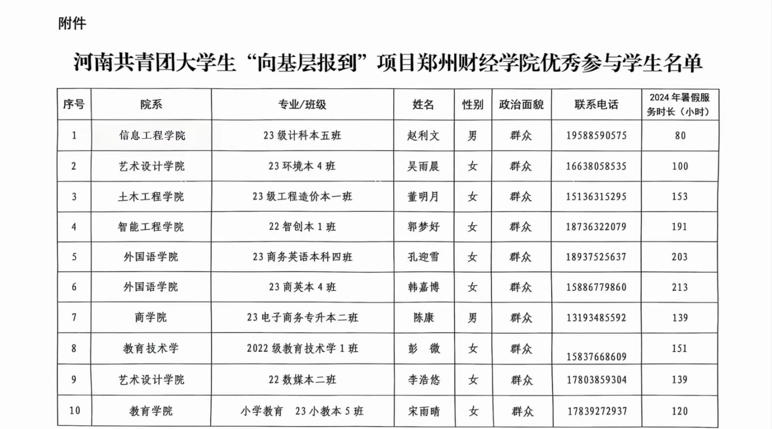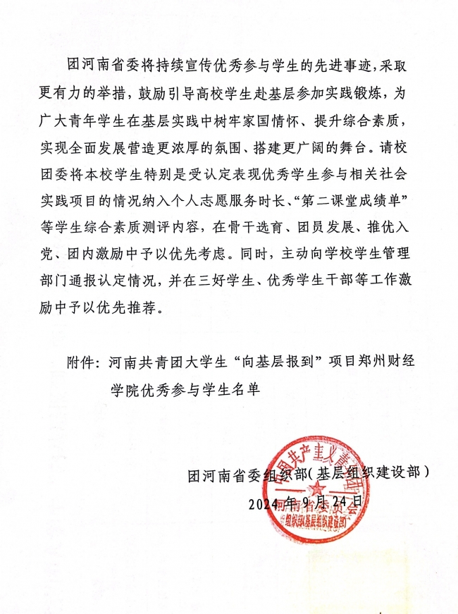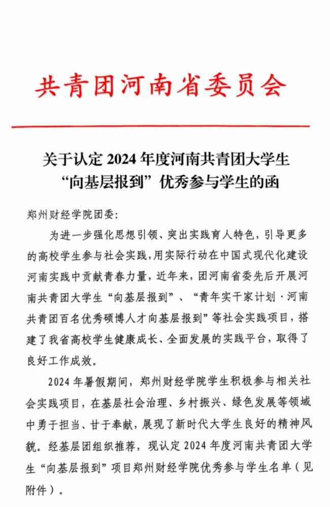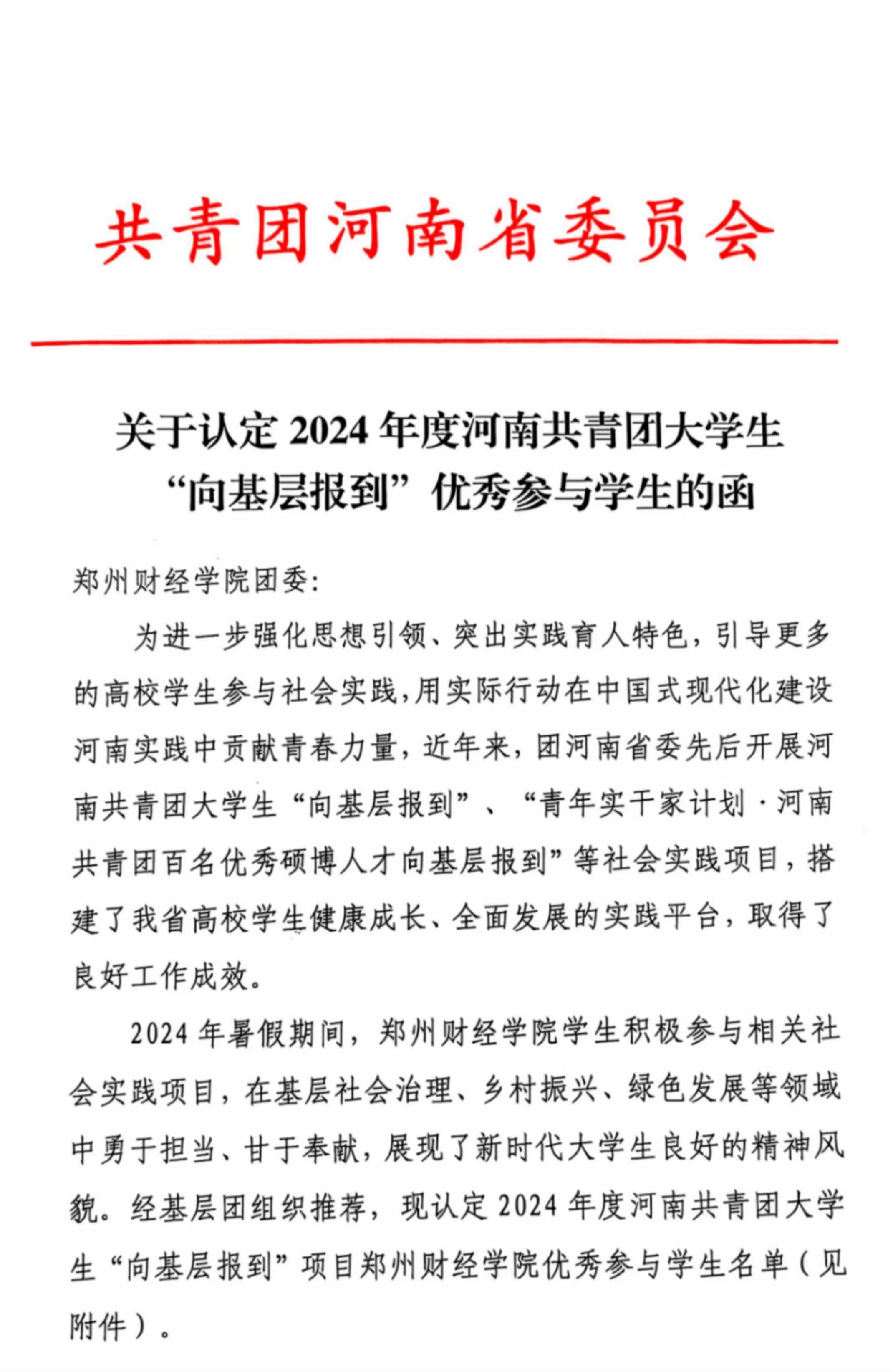 近日,共青团河南省委员会印发《关于认定2024年度河南共青团大学生“向基层报到”优秀参与学生的函》,文件肯定了万象城大学生在“向基层报到”等社会实践项目中的突出表现和卓越贡献,万象城赵利文等20名同学被团省委认定为优秀参与学生。
