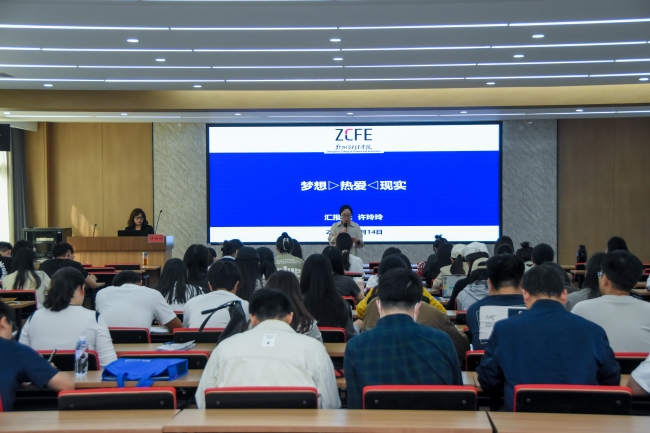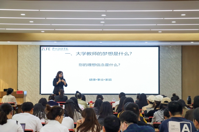 许玲玲开场以“我们在哪里?”和“我们的价值体现”两个问题引入,通过一系列数据展示教师对社会的贡献,激发新教师们的职业自豪感。随后,她通过“大学教师的梦想是什么”“大学教师与学校的关系”“大学教师教学与科研的关系”“大学教师与同事的关系”“大学教师的自我认同与保持热爱”五个方面分享自己的职业历程与感悟。她以“高校教师十项行为准则”为基准,以“四有”好老师为导向,指引新教师明晰职业梦想。她指出,在科研道路上“与其观望,不如行动”,同时结合自身经历鼓励新教师积极参与科研,将科研与教学相融合,尽快提升自己。最后,许玲玲寄语新教师:眼中有光、心系学生、保持热爱、持续学习,在郑财这片沃土上追求梦想、实现梦想。