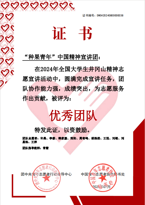 历经一次次的宣讲,伟大的井冈山精神已渐渐融入每一位“种果青年”宣讲团成员的火热青春里。宣讲团成员也凭出色的表现和团队协作圆满完成宣讲任务,被团中央青年志愿者行动指导中心、中国青年志愿者协会秘书处评为全国大学生井冈山精神志愿宣讲优秀团队。