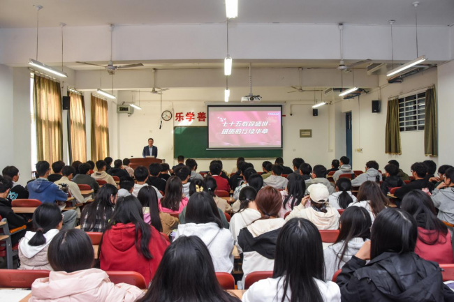 为深入学习贯彻习近平新时代中国特色社会主义思想和党的二十届三中全会精神,10月23日,校党委书记马治军以《七十五载迎盛世,砥砺前行续华章》为题,在育爱楼313教室为信息工程学院2024级网络工程本科1班、2班学生讲授了一堂生动的思政课。