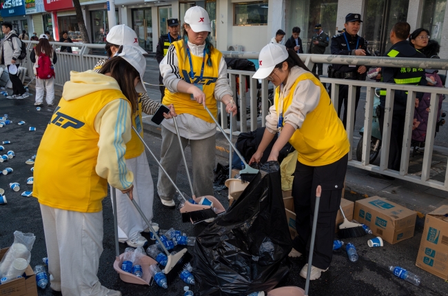赛程结束后,志愿者们自觉投入到赛道清理工作中,努力将马拉松赛道还原至整洁状态,展现出郑财青年志愿者的良好形象。