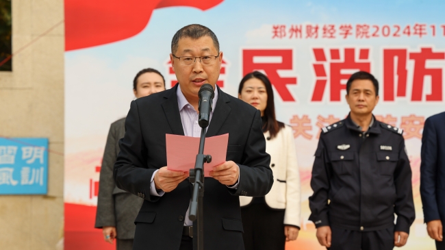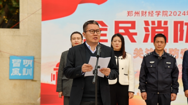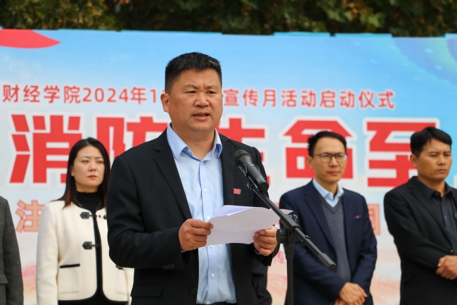 金融学院党总支副书记姚明全作为教师代表进行发言,他提出要在言传身教中重视消防安全工作,通过教育一名学生带动一个家庭,挽救一个家庭带动一个社会,要身体力行,做消防安全知识的学习者、践行者、传播者和守护者,为构建和谐安全稳定的校园环境贡献自己的力量。